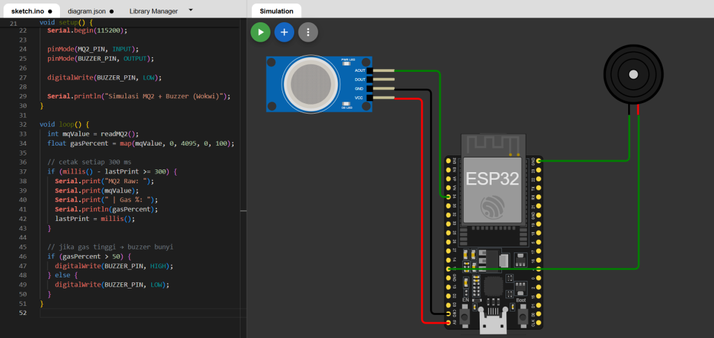 Serial.println("Simulasi MQ2 + Buzzer (Wokwi)");