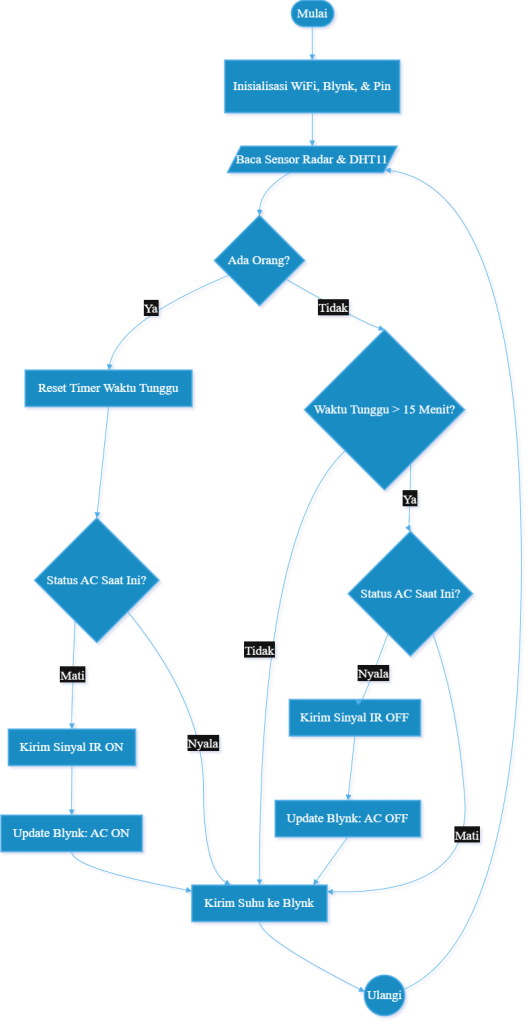 Logika kerja sistem dimulai dengan inisialisasi WiFi dan sensor. Sistem akan terus membaca status sensor radar. Jika terdeteksi keberadaan manusia, sistem akan mereset timer dan memastikan AC menyala. Jika tidak ada orang, timer akan berjalan. Apabila waktu tunggu (15 menit) terlampaui, sistem memerintahkan AC untuk mati.