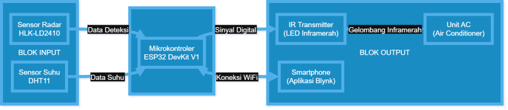Secara garis besar, sistem Smart AC Controller ini terdiri dari tiga bagian utama: Input, Proses, dan Output. Sensor HLK-LD2410 dan DHT11 bertindak sebagai masukan yang mengirimkan data kondisi lingkungan. ESP32 DevKit V1 berfungsi sebagai unit pemroses pusat yang mengolah data tersebut. Output dari sistem ini berupa sinyal Inframerah ke unit AC dan data digital yang dikirim ke aplikasi Blynk melalui jaringan WiFi.